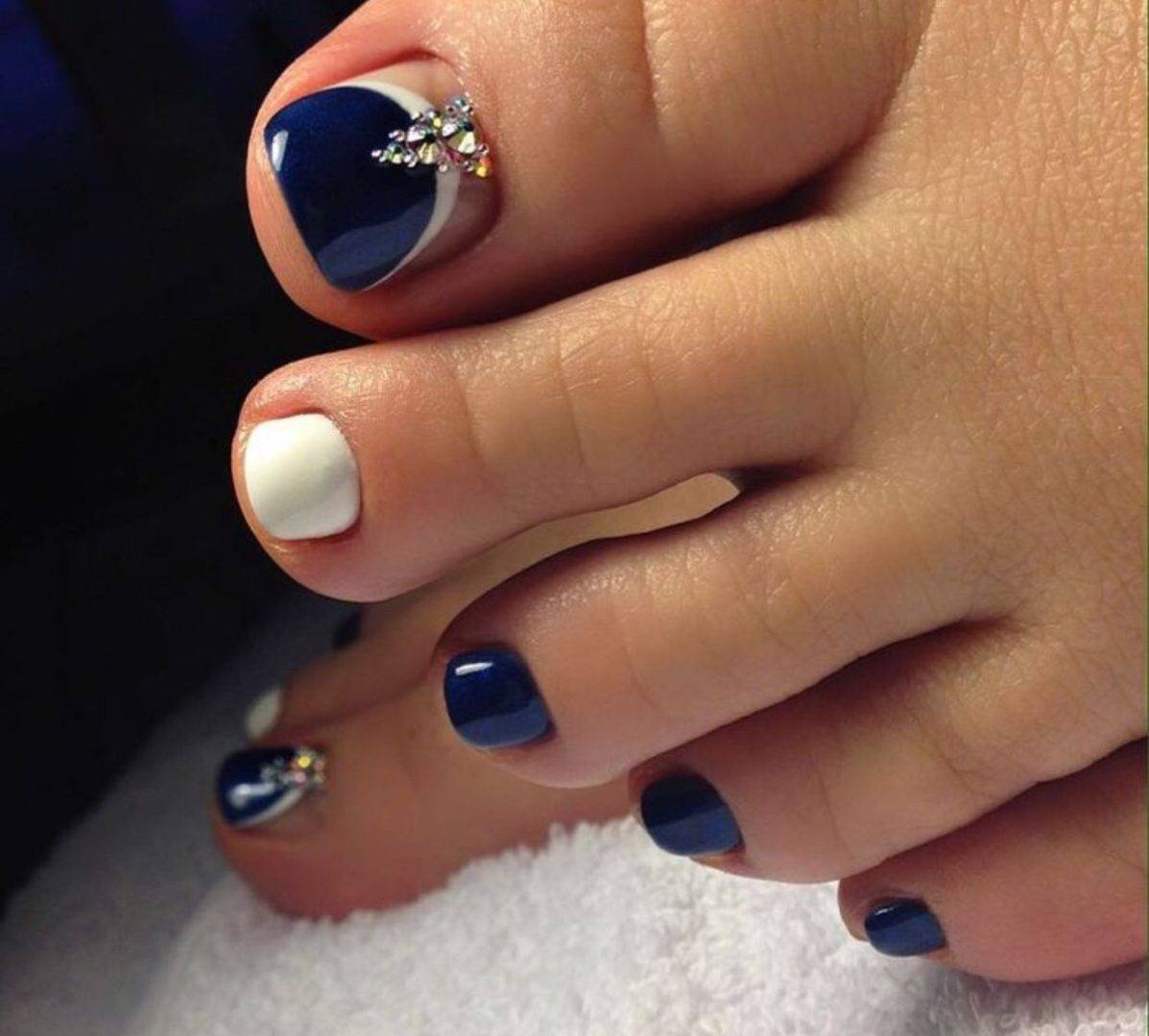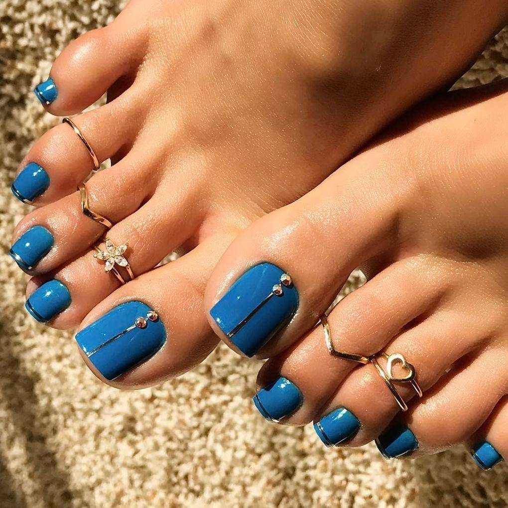 Педикюр в более ярких тонах, таких как синий, уникальным образом подчеркивает ноги. Кстати, загар с таким цветом выделяется не менее чем с белым.