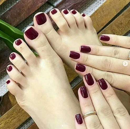 Прежде всего – это просто одинаковый цвет лака или гель-лака, которым можно покрыть как ногти на руках, так и на ногах. Можно использовать матовый топ, чтобы разнообразить эффект.