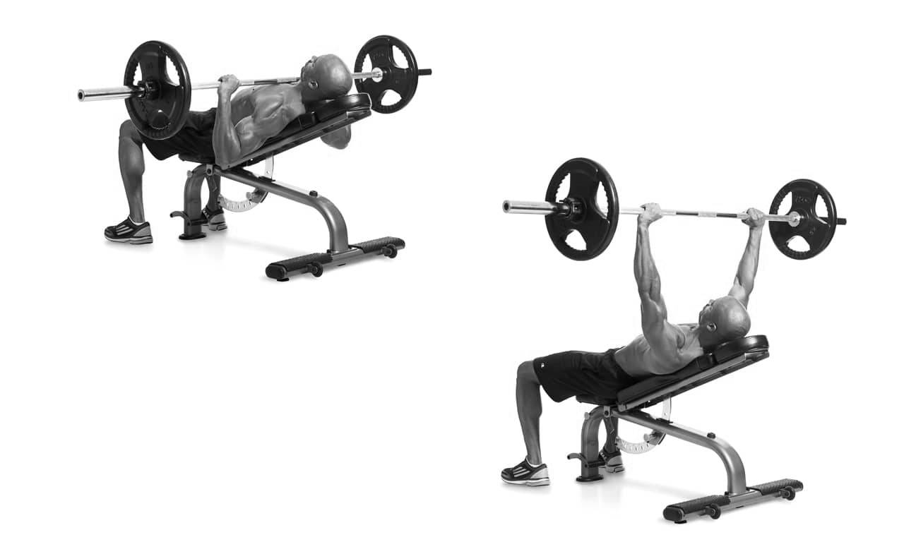 Это же касается и жимов. «Работайте ритмично. Здесь мы должны закачать в мышцы как можно больше крови, прежде чем приступать к жиму более тяжелой штанги на наклонной скамье», — комментирует он.