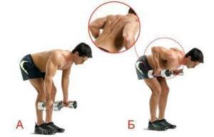 Одно из основных упражнений для того, чтобы накачать спину — тяга гантелей в наклоне. Оно разрабатывает широчайшие мышцы, задействует каждую половину спины. Ноги слегка согнуты, корпус наклоняется под девяносто градусов. В руках гантели. Локти направляются строго вверх, а руки с гантелями поднимают вдоль тела до соединения лопаток. Возврат к исходной позиции делается медленно.
