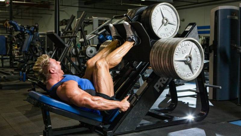 Атлет выжимает ногами платформу с установленным весом в специальном тренажере. За счет фиксации спины снижается опасная нагрузка на поясничный отдел.