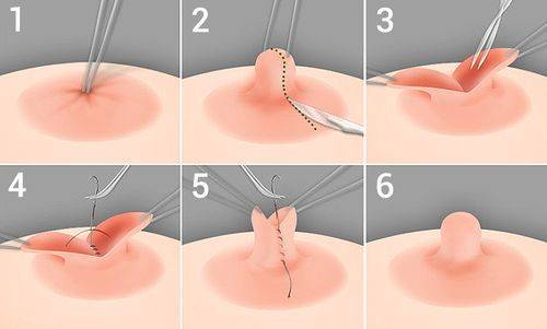 Обязательным элементом качественной операции является устранение периолярной грыжи (если она есть) и исправление асимметрии желез.