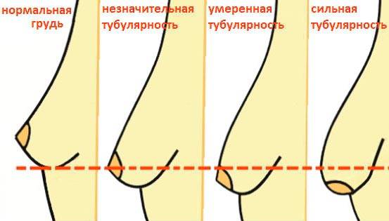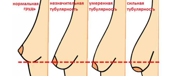 1 степень. Еле видные изменения. Из-за невысокого дефицита снизу и внутри груди железистой ткани, грудь смотрит вверх, а сосок – вниз. Коррекция требуется редко.2 степень. При недостаточном количестве железистой ткани снизу и сбоку молочных желез, грудь смещается вниз, сосок выглядит плоским, увеличивается ареола.3 степень. Сильный дефицит железистой ткани по всей груди. В этом случае происходит сильное вытяжение железы, растягивание ареолы. Сосок в этом случае – абсолютно плоский.
