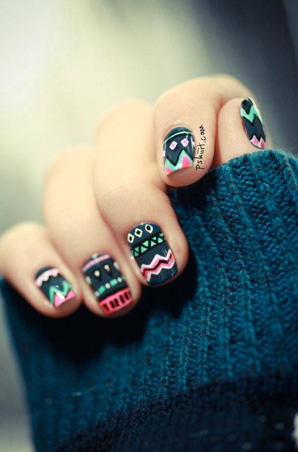 Проще всего сделать на ногтях точки, линии и другие геометрические фигуры. Они могут наноситься упорядочено или хаотично. В самом начале ноготь покрывается базовым цветом. После того, как слой лака подсохнет, при помощи кисточки рисуются линии, а иголкой можно нанести аккуратные точки.
