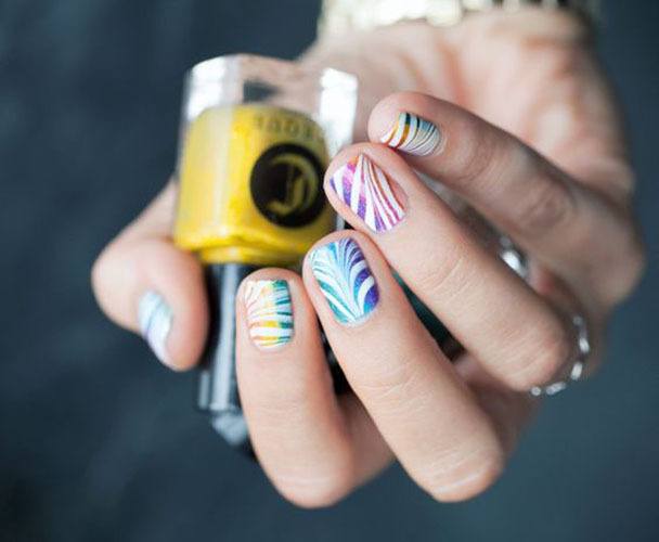 - Самый важный этап: нужно окунуть палец ногтем вниз в то место на поверхности воды, где рисунок получился наиболее удачным. Делается это одним движением. Не стоит надолго задерживать палец в воде. Вынув палец, нужно аккуратно убрать ватой или спонжем лишний лак вокруг ногтя. После чего процедура полностью повторяется с каждым из оставшихся неокрашенным пальцев.