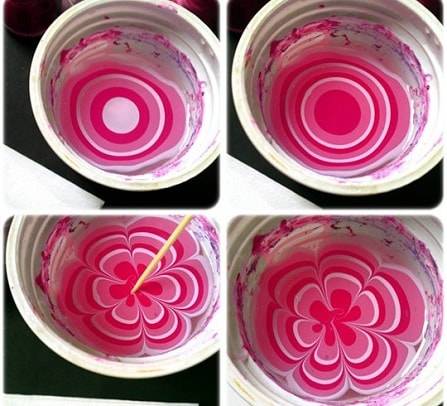 Когда поверхность воды стала представлять собой разноцветные круги, можно делать рисунок. При помощи зубочистки или тоненькой деревянной палочки по лаковой поверхности проводим линии. Уже несколько движений дадут необычный узор. Если же проводить линии в определённом направлении, можно добиться удивительных эффектов.