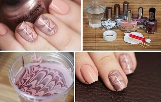 Изучив нюансы техники, можно смело делать такой маникюр дома. Для этого нужно приготовить инструменты и средства: несколько понравившихся оттенков лака, емкость с теплой водой, иголку (зубочистку). На всякий случай рядом нужно положить средство для снятия лака или специальные салфетки.