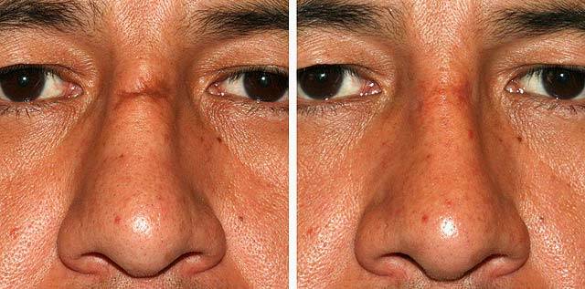 С помощью отбеливания можно сделать визуально практически незаметными шрамы от прыщей, от укусов комаров, от мелких ожогов. Такого рода рубцы чаще всего образуются на лице и спине, имеют нормотрофические или признаки, а именно, располагаются на одном уровне со здоровой кожей или втянутые, выделяются цветом.