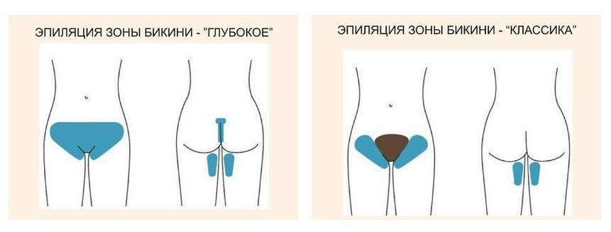 При эпиляции глубокого бикини охватываются и другие зоны, а именно весь лобок, половые губы и область между ягодицами. В зависимости от того, в какой зоне вы хотите убрать волосы, «глубина» бикини изменяется. Популярна эпиляция «под стринги», по названию становится ясно, что убираются все волоски, которые оказываются не под данным видом трусиков.