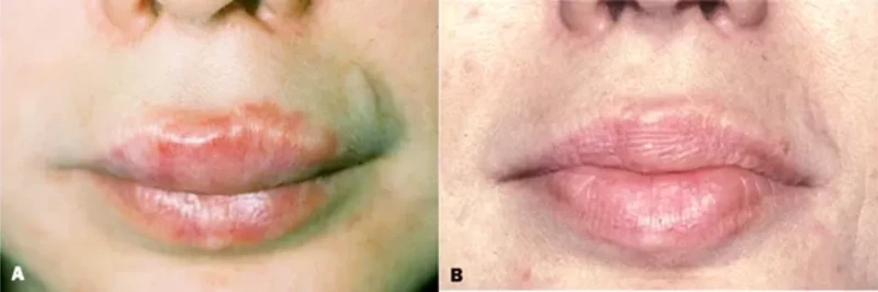 - Изменение цвета красной каймы – на нежной коже губ проступают явно различимые пятна.