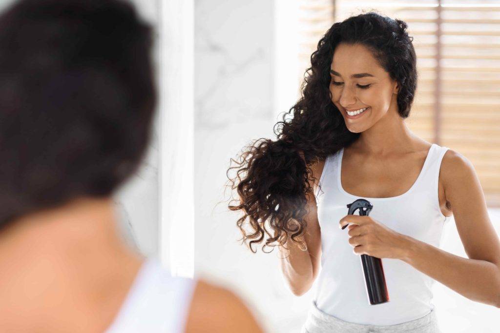 И финальный штрих по уходу за волосами – использование несмываемых средств: спреев или кондиционеров. Они являются важным этапом для структурирования завитка. Для формирования кудрей средство наносим на ладони, а затем сжимающими движениями снизу вверх.