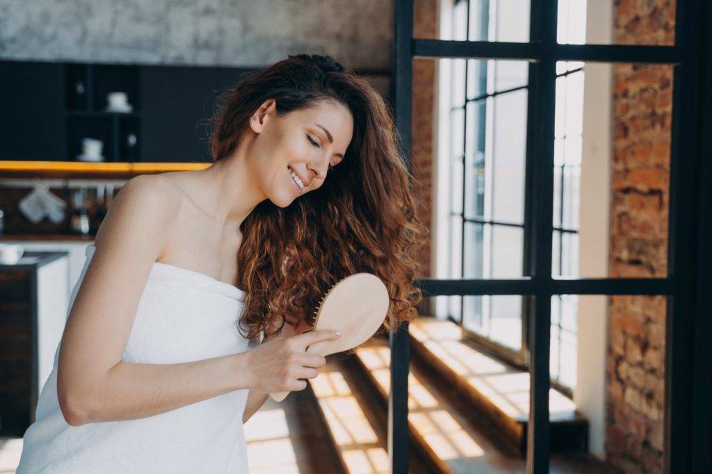 - Не расчесывайте влажные волосы: Влажные волосы уязвимы для ломкости. Расчесывание влажных волос растягивает пряди и может изменить их текстуру. Используйте распутыватель, щетку из натуральной щетины, расческу с широкими зубьями или пальцы, чтобы расчесать волосы после душа, чтобы предотвратить вьющиеся волосы.