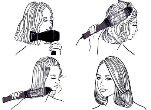 - Расческой брашингом подхватывай прядь от корня и протягивай вниз, одновременно направляя на волосы воздух фена. Концы можно слегка подкрутить расческой вовнутрь;
