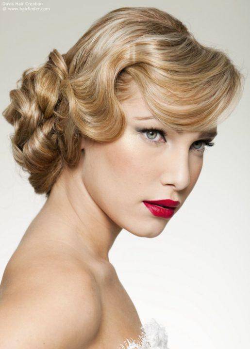 Укладка с завитой челкой, зачесанной на один бок, фото