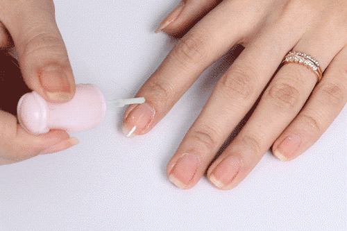 После обезжиривания наносится база. В отличие от классического лака, начинать нужно со свободного края, и двигаться к основанию ногтя. Остановиться, не дойдя 2 мм до кутикулы.
