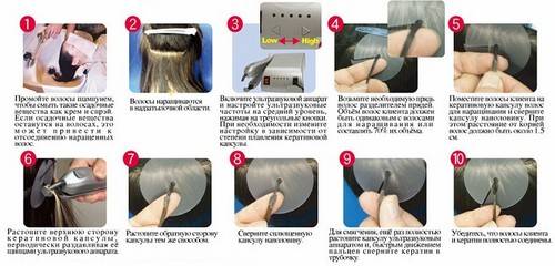 Технология наращивания волос заключается в том, что специальным прибором, который размягчает капсулы без помощи высоких температур, а под воздействием ультразвуковых импульсов, следовательно, не вредит волосам и коже головы. Закрепляются донорские прядки за счет специальных кератиновых капсул. Они обеспечивает долгую носку наращённых прядей, так же защищают натуральные пряди от выпадения вместе с донорскими.