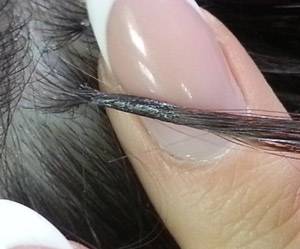 - Необходимо нанести на места крепления капсул специальный раствор. Зачастую используется препарат, в состав которого входит ацетон, что очень вредно. Потому следите за тем, что наносит на пряди мастер;