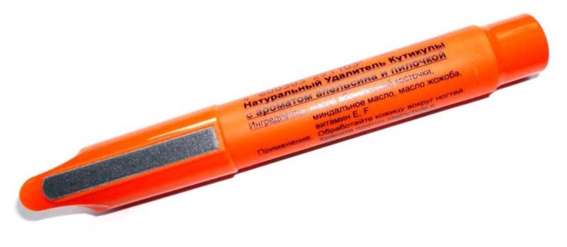 В современных магазинах можно увидеть и карандаши для кутикулы. По поводу эффективности этого средства споры идут до сих пор. Он действительно похож на косметический карандаш. Только вместо грифеля он наполнен маслянисто-щелочным составом. Масло размягчает кожу, а щелочь разъедает омертвевшие клетки. Этим инструментом удобно пользоваться, но не всегда он справляется со своей задачей. Если кожа слишком плотная, с помощью такой жидкости ее убрать сложно.