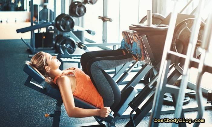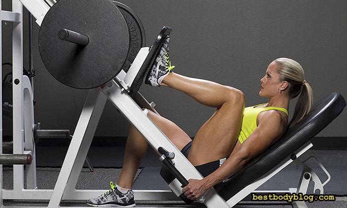Это упражнение почти полностью повторяет биомеханику приседаний со штангой, снимая при этом часть нагрузки с поясницы и позвоночника. Таз и плечи необходимо крепко прижать к спинке тренажёра, а ступни ног нужно расположить максимально широко и высоко, колени опускать необходимо как можно ниже. Помимо ягодичных мышц, в этом упражнении активно работает бицепс бедра. Количество подходов в этом упражнении 3-4, количество повторений 10-12.