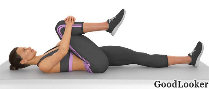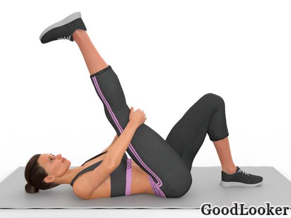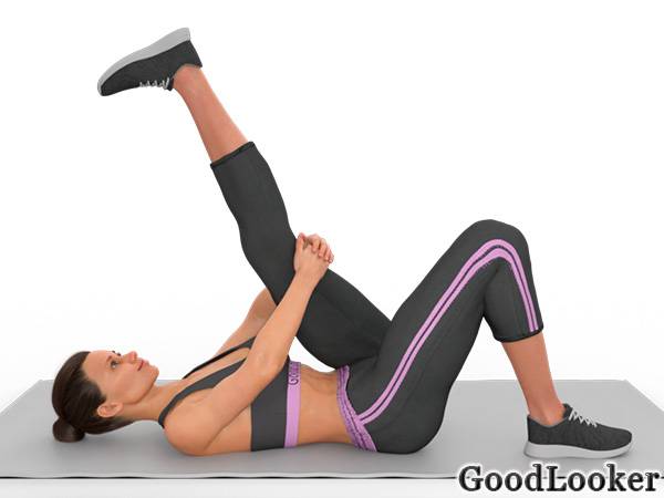 Упражнение: поднять обе ноги над полом как можно выше, напрягая мышцы ягодиц, затем опустить ноги к полу, но без касания.