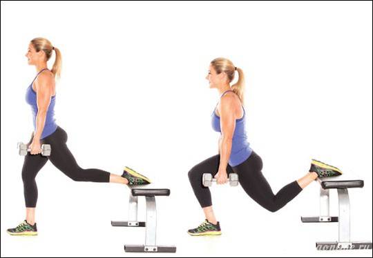 - Еще выпады, однако в это раз с отведением рук назад-вверх с гантелями (свести лопатки) — 2-3 подхода по 12-16 раз на каждую ногу.