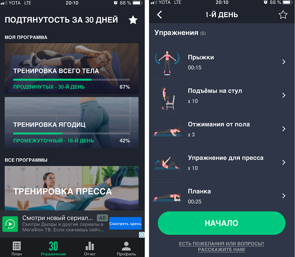 Однажды мне пришла мысль установить фитнес-приложение. Выбирала наугад, но получилось удачно: скачала приложение «Подтянутость за 30 дней» (у меня для iOS, есть и Android). В нем упражнения для трех уровней: начинающий, промежуточный, продвинутый. Для каждого уровня два 30-дневных комплекса. Приложение бесплатное, но есть встроенные покупки (я ими не пользуюсь).