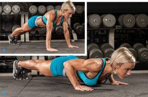 Комплекс с отжиманиями позволяет комплексно воздействовать на весь плечевой пояс, пресс и мышцы задней поверхности бедра. Примите положение лежа, с упором на ладони и пальцы ног. Сгибая руки в локтях, старайтесь максимально приблизить грудь и голову к полу. Распрямляя руки, возвращайтесь в исходное положение. Следите за тем, чтобы все тело оставалось ровным — на одной оси. Если выполнение дается слишком сложно, можете начать с положения упор на ладони и на колени.