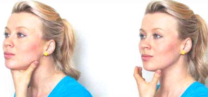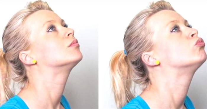 - Сядьте, голову запрокиньте назад. Делайте движения подбородком, как будто хотите верхней губой захватить нижнюю. Повторите упражнение 30 раз;