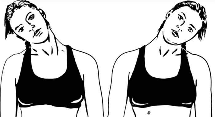 - Голову слегка наклоните вперед и подбородком потянитесь то к левому, то к правому плечу;