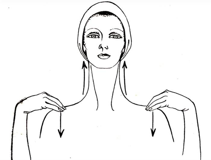 - Ладони прижмите к центру лба, медленно продвиньте их к вискам. Затем немного ослабьте и двигайте сбоку шеи до ключицы. Выполняйте 3 раза