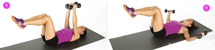 Ложимся на пол или скамью, подняв руки вверх. Опускаем их на выдохе к полу и поднимаем снова вверх. Усложняем упражнение, добавив после подъема заведение сомкнутых рук над головой.