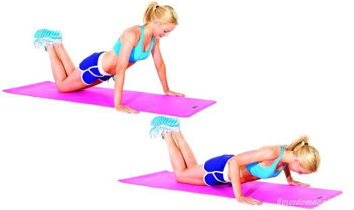 - Садимся на пол и сгибаем колени. Руки расположены сзади туловища в упоре в пол. Напрягая мышцы и разводя локти в стороны, опускаем туловище вниз и возвращаемся назад.