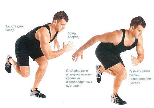- Приседания-прыжок. Принимаем положение как для классического приседа. Опускаемся и отталкиваемся от пола, прыгаем.