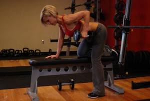 Исходное положение: берём в правую руку гантель прямым хватом, левое колено ставим на скамью, левая рука также упирается на скамейку, спина параллельно полу.