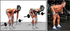 Исходное положение: спина ровная, прогнутая в пояснице, наклон вперёд, ноги немного согнуты в коленях, взгляд устремлён вперёд, хват за штангу чуть шире плеч.