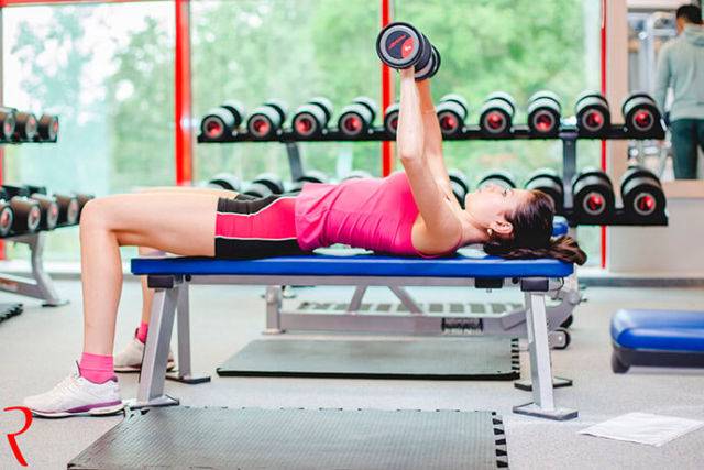 Нужно встать перед скамьей, держа одной рукой гантель. Поднимите ее максимально вверх, чтобы плечо было параллельно полу, опустите обратно. Корпус при этом должен оставаться прямым – меняется только положение руки. Завершив подход, повторите упражнение другой рукой.