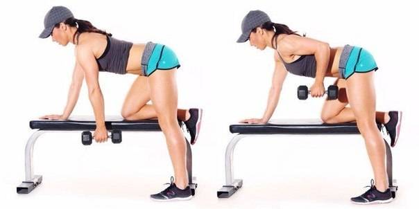 Упражнение с гантелей на скамье (с упором на твердую поверхность). Встаньте так, чтобы одна рука упиралась на скамью и была выпрямлена, а колено этой же стороны лежало на поверхности упора, то есть корпус параллелен скамье. Другая рука расположена перпендикулярно полу, с гантелей. Нога помогает удерживать равновесие, упираясь в пол. Вдыхаем, напрягаем мышцы спины и поднимаем гантель, немного заводя руку за спину. Локоть поднимается вертикально. Вернитесь в исходное положение.