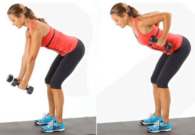 В обе руки возьмите гантели. Чуть согните колени и наклонитесь вниз, пока спина не будет параллельна полу. Выпрямитесь, выдержав небольшую паузу