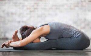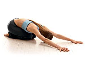 - Сесть, поджав под себя ноги. Наклониться вперед, вытянуть руки перед собой, лицо смотрит вниз. Потянуться за руками и расслабиться.