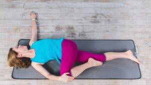 - Скручивание спины. Лёжа на спине, вытянуть левую ногу и согнуть в колене правую. Нужно перекинуть правую ногу через левую, не отрывая лопаток от пола. Задержаться на минуту и повторить для другой стороны.