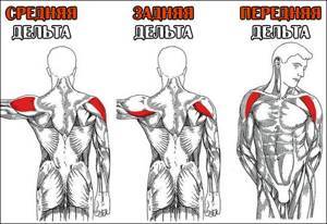 Плечевой сустав покрывает дельтовидная мышца, которая делится на три пучка: передний – обладает функцией сгибания руки и бокового отведения при наружном вращении плеча, средний – горизонтально отводит руку, задний – обладает функцией разгибания руки. В упражнениях, в которых руки выполняют фронтальные подъёмы, участвует передняя дельта. Средняя дельта работает при боковых отведениях – махах, жимах. Задняя дельта способствует отведениям – тягам и махам рук назад