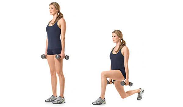 | Выпады с гантелями | 4*20 для каждой ноги | 1. Расположиться вертикально; в руках зафиксировать спортивные снаряды нужной массы; спину выпрямить; стопы поставить вместе.