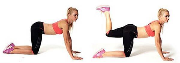 - Оставаясь на одном колене, поднимайте согнутую в колене под прямым углом противоположную ногу вверх так, чтобы включалась ягодичная мышца, но не перегружалась поясница.