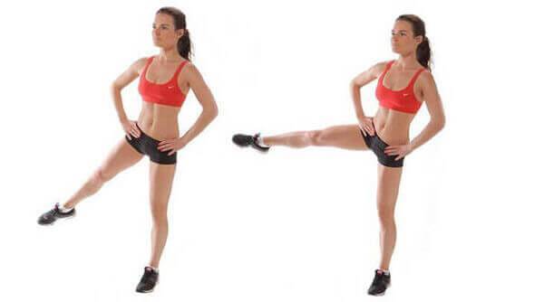 - Стоя боком у опоры, например стены, перенесите вес тела на ближайшую к стене опорную стопу, а вторую приподнимите над полом и выполните мах ногой в сторону, не вращая тазобедренным суставом и не смещая корпус в стороны.