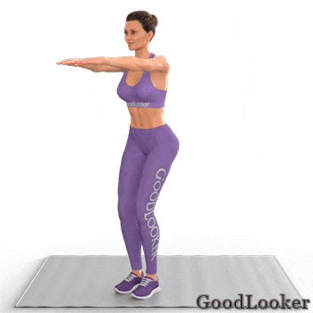 Поставьте ноги на ширине плеч или немного шире. Вытяните руки перед собой и затем приступайте непосредственно к приседаниям, держа голову прямо.