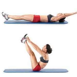 - Синхронно поднимайте вверх и торс, и ноги. Опора – на ягодицы. Ноги можно немного согнуть, если вам тяжело держать их прямыми