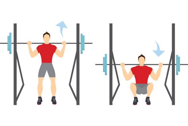 - Расположитесь под штангой. Она должна лежать на ваших трапециевидных мышцах. Ширина хвата — чуть шире плеч.