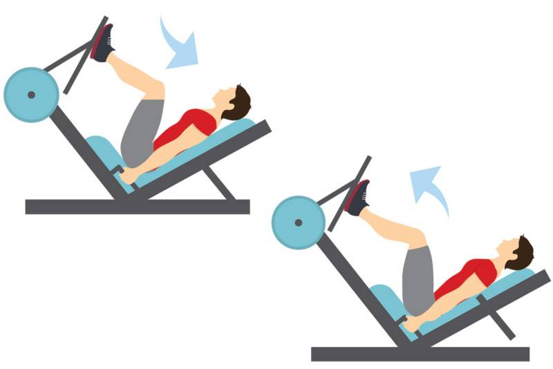 Концентрированная проработка мышц ног. Выполняя жим ногами квадрицепсы и бицепсы бедер получают концентрированную, целевую нагрузку. Это достигается за счет экономичности и простоты движения (сгибание-разгибание) и выключения мышц стабилизаторов.