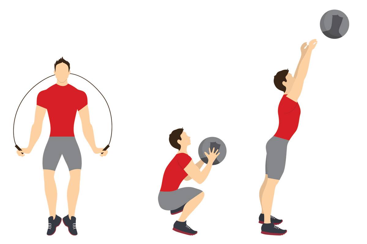 Прыжки на скакалке, упражнения с мячом и упражнения с гирей. Важны для развития взрывной силы ног.
