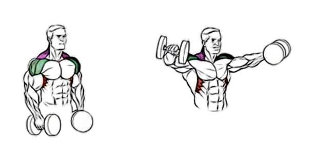 Базовое упражнения для проработки дельтовидных мышц, главным образом среднего пучка. Также задействуются трапециевидные мышцы.
